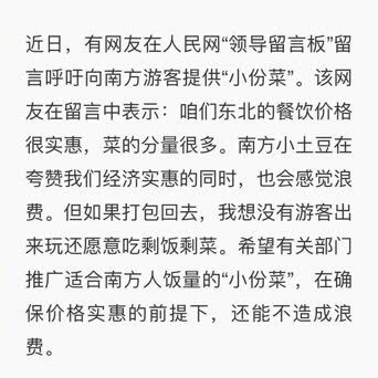 【建议餐馆向南方游客提供小份菜,有这个必要吗?】随着哈尔滨的出圈走红,整个黑龙江文旅的关注度也在上升。近日,有网友在人民网“领导留言板”留言呼吁向南方游客提供“小份菜”。