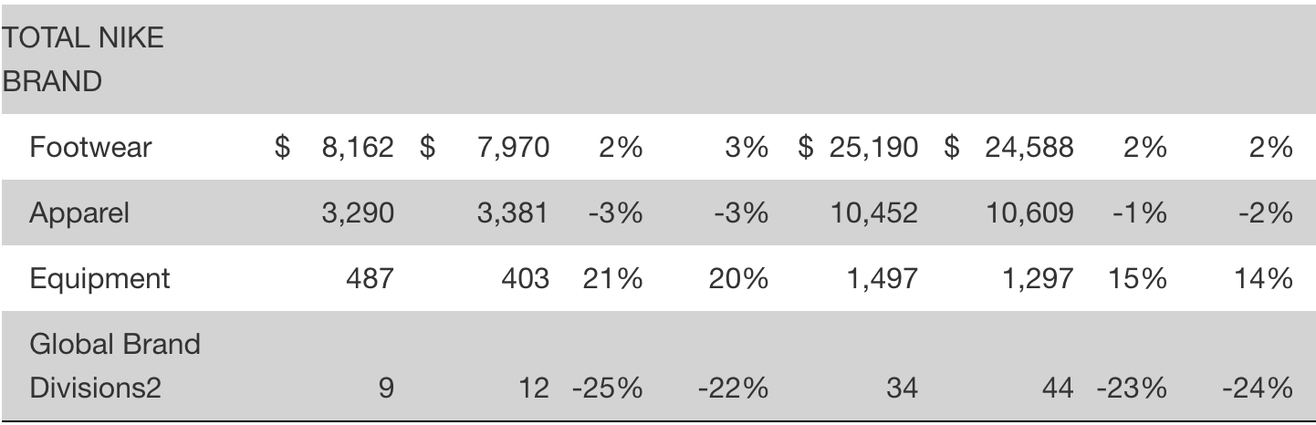 分品类划分,第三财季耐克品牌中,鞋类收入占比最高,近七成,达81.62亿美元,同比增长2%,在汇率不变的基础上同比增长3%。服饰收入为32.9亿美元,下降3%。装备收入为4.87亿美元,同比增长21%,在汇率不变的基础上增长20%。