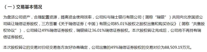 北京国资将入主瑞信证券!方正证券和瑞银拟转让合计8501%股权